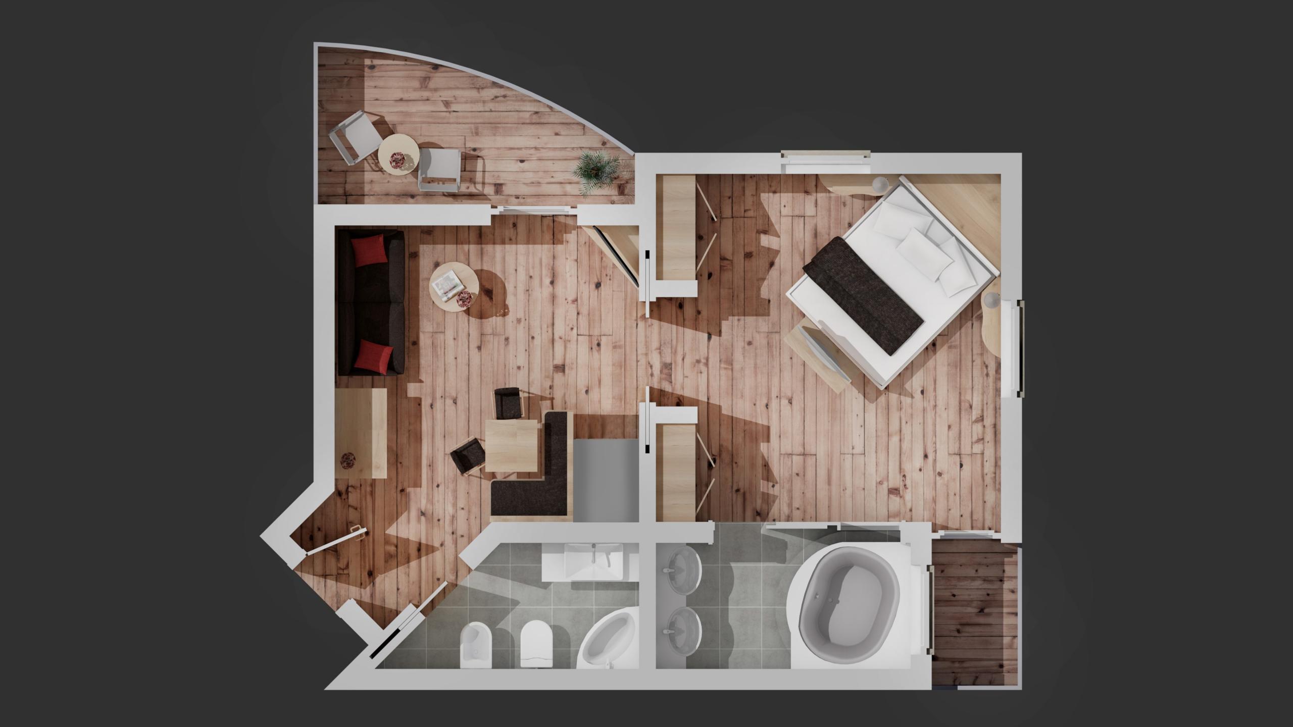 Suite mit Holzboden, zwei Balkonen und separatem Wohnraum, Badezimmer mit Dusche, WC, Doppelwaschbecken und Badezimmer mit Whirlbadewanne, Föhn, Telefon, Sitzecke, Safe, Minibar, LCD-TV, Kachelofen, WLAN, Tiefgaragenplatz.